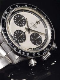 From the 1980s on, the Paul Newman Daytona started to increase its value on the international market, thus becoming the most craved collection watch allover the world. Nowadays, the screw-down buttons models reach the highest quotations and the most appealing between black dial with off-white registers and off-white dial with black registers versions is the second one, the so called ‘Panda’ version.