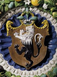 As is well-known, coats of arms and heraldic ornaments played a special role in the vast tin-glazed terracotta production of Della Robbia, jealously handed down for over a century in the Florentine workshop of Via Guelfa through the commitment of three generations: Luca - sculptor, celebrated by the contemporaries as one of the pioneers of Renaissance style -, his prolific nephew Andrea and his five sons, Marco, Giovanni, Luca 'the Young', Francesco and Girolamo (Gentilini 1992, I Della Robbia 1998, Idem 2009). The production of works in enamelled terracotta painted with brilliant and long-lasting polychrome pigments guaranteed a very effective and, above all, constant representation of the coats of arms. In fact, thanks to the graceful and elegant ability to create garlands enriched with all the gifts of nature - similar to the realistic decorations of the classical artists described by Plinius (Gentilini - Mozzati 2009) -, the coats of arms of Della Robbia soon became very famous and were considered one of the most representative and appreciated artistic expressions of Della Robbia. This is testified by numerous publications on the production of Della Robbia written by scholars such as Allan Marquand (1919) or more recently, Renzo Dionigi (2014). Dionigi also identified the work that we are presenting here, attributed to Giovanni della Robbia and dated around 1520 (Dionigi 2014, p. 113, no. 29).