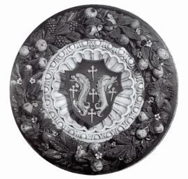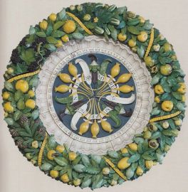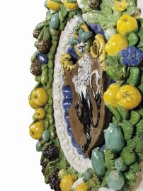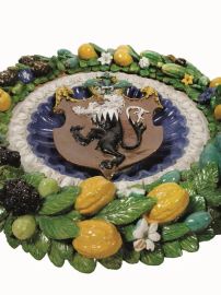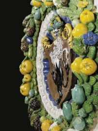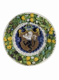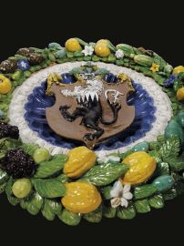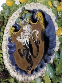 The coat of arms stands out from the gadrooned bowl, enamelled in deep blue to simulate the precious lapis lazuli stones, and is embedded within a 'band' frame inside a moulded egg-and-dart inner border, glazed in white to resemble marble, and covered in the centre by the crest with a refined space solution. The diameter of the bowl is one Florentine braccio, that of the frame one and a half braccia. The medallion is framed by a copious, colourful garland with foliage which combines the classical motifs with a renovated modern style. This abundant wreath, characteristic of the renown Della Robbia production (Quinterio 1998; Mangiavacchi - Pacini 2002, pp. 172-179, 182, 204-206), is infact interspersed with a wide variety of fruits (oranges, pine cones, quinces, black grapes, figs, citrons) and vegetables (broad beans, cucumbers, garlic bulbs), each with its specific foliage and flowers, alternated with numerous poppy seeds - with their heraldic significance - and with other white and light blue small flowers (bellflowers, wild roses, jasmines ?). Hidden among the leaves three small animals appear: a sinuous lizard, a tiny frog and a snail coming out of its shell - probably shaped using real animals following a recurring technique in the works of Giovanni della Robbia, as described in the short treaty of Cennino Cennini (about 1400) and well attested in the bronze and terracotta sculptures of the Florentine Renaissance, that later inspired the production and diffusion of the extravagant 'rustic' pottery of Bernard Palissy in the middle of the sixteenth century.