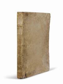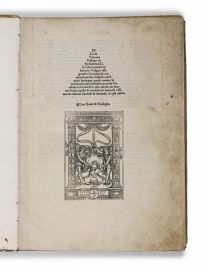 Folio (393 x 280 mm). [iv] CLXXXIII [I] [6] ll. Collation π2 A-Z8 π6. Printer’s device on title-page and on l. Z7v. 117 wood engravings, 10 of them full-page. Numerous large ornate initials. Text enclosed within commentary. Eighteenth-century binding in full vellum over boards with hand-written title on spine. Figured bookplate of Sergio Colombi on inner front cover, label of “Libreria Carlo Clausen già Ermanno Loescher” on verso of front fly. One typewritten and one hand-written card pasted to the recto of front fly and surrounded by minute hand-written notes, another loose hand-written card. Leaves π3-π8 bound at the end of the volume, probably when it received the current binding (originally they were at the beginning); title-page reinforced to outer margin; a few other reinforcements to inner and outer margins, and some minor restoration; quire “D” with a short worm-trail that has been restored on some leaves, with minimal portions of text hand-written to imitate the print; last two ll. restored at the top and with pagination and title hand-written to imitate the print; pale marginal water-stains; occasional marginalia in an old hand. Overall a very good copy, with fresh wood engravings, and with the two famous plates of the Vitruvian Man not censored.
