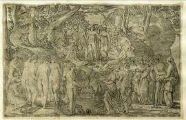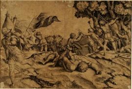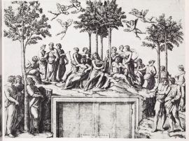 As often happens in his works, this majolica master craftsman of Rovigo often recurred to engravings, as we can see in our dish. The central figure, one of the most frequently depicted by this painter, is a copy inspired by one of the young girls (see fig. 1) of Giangiacomo Carraglio's engraving depicting The Contest between the Muses and the Pierides by Rosso Fiorentino (Bartsch 28, p. 186, no. 53). The figure of Cephalus is, instead, drawn from a figure in the background (see fig. 2) of the engraving of Marcantonio Raimondi depicting David Slaying Goliath by Raphael (Bartsch 27, p. 19, no. 10-I.12) while that of Love is a copy of one of the putti (see fig. 3) of the engraving Parnassus of Marcantonio Raimondi by Raphael (Bartsch 26, p. 244 no. 247). The source of Procris' figure has not been identified yet, even if it also appears on a plate, dated between 1535 and 1540, depicting Saint Catherine of Alessandria, attributed to Francesco Xanto Avelli and held in the Museum of Ecouen (inv no. ECL 2344).
