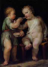 "Le due tele qui riprodotte rappresentano due gradevolissime scenette con putti: la prima li mostra in una specie di danza che si confonde quasi con una specie di lotta ludica che nulla ha di aggressivo; la seconda ci mostra uno dei due fanciullini intento a nutrire il compagno con un fare molto protettivo e tenero.