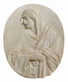La Mater dolorosa di questo rilievo ovale in marmo replica un’invenzione, divenuta preso celeberrima, di François Girardon, ovvero il suo morceau de réception all’Académie royale de peinture et de sculpture di Parigi, presentato dall’artista nel 1657 (cm. 85 x 65); già collocato nella prima sala dell’Académie, dove è attestato nel 1715 (anno della scomparsa del maestro), il rilievo passò poi al Musée des Monuments français nel 1795, all’École des beaux-arts nel 1816, e infine al Louvre, dove tuttora si conserva, nel 1816 (Musée du Louvre – Sculpture française II, Renaissance et temps modernes, I, Paris1998, p. 395, cat. RF 3148; Alexandre Maral, François Girardon (1628 – 1715). Le sculpteur de Louis XIV, Paris 2015, pp. 47 e 466, cat. S.19). Le fonti attestano l’esistenza di un modello preparatorio in terracotta, di un altro in gesso che venne donato al cancelliere Séguir nel maggio del 1657, e di una replica sempre in terracotta dorata, inviata dallo scultore a Troyes, dove è citata nel 1780; nessuna di queste versioni è attualmente nota (Maral, op. cit., p. 481, catt. Sem. 2-4). Un’ovale in bronzo di dimensioni minori, cm. 36,8 x 29,2, era nel 1971 nella collezione del conte Ciechanowiecki a Londra (Europäische Barockplastik am Niederrhein: Grupello und sein zeit, catalogo della mostra (Düsseldorf, Kunstmuseum), Düsseldorf 1971, p. 366, cat. 332). Sebbene quasi sovrapponibile al suo modello in marmo del Louvre, ad esempio nell’esatta posizione delle dita delle mani, questa versione presenta comunque qualche variante, soprattutto nella semplificazione delle pieghe del mantello sopra la testa e nell’espressione stessa della Madonna, meno pateticamente atteggiata. D’altronde anche il bronzo esposto a Düsseldorf nel 1971 differisce dal marmo di Giradon in molti passaggi delle pieghe del mantello (ad esempio in quelle che ricadano dal capo, a sinistra).