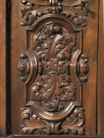 in noce, fronte a due sportelli con due piccoli sportelli sottostanti intagliati a rilievo con motivi fogliacei entro riserve sagomate, angoli scantonati ornati da grandi nastri terminanti in riccioli su due sportelli in forma di plinti intagliati a cartelle sagomate tra volute fogliacee, grande cappello modanato con fascia centrale intagliata a decori fogliacei con fiori agli angoli, fianchi sformellati, su piedi a mensola, cm 254x190x80