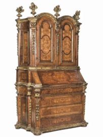 in noce, radica di noce e altre essenze con profilature in oro, cornici intagliate a motivi fogliacei, corpo superiore terminante con cinque pinnacoli in foggia di vasi con fiori, di forma scantonata con due sportelli arcuati sul fronte e altri due sui fianchi laccati internamente a finto marmo, inquadrati da lesene ornate da festoni e sormontati alternativamente da mascheroni e volute, corpo inferiore anch'esso scantonato con ribalta celante otto cassettini e numerosi segreti, fronte a quattro cassetti di cui il primo più sottile con sportelli laterali anch'essi inquadrati da lesene ornate da festoni e sormontate da capitelli corinzi, piedi a cipolla schiacciata; gran parte della superficie è intagliata a motivi floreali non pertinenti, cm 230x147x63
