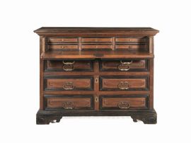in noce con cornici in legno ebanizzato, piano rettangolare a becco di civetta, un cassetto a ribalta sotto la fascia ornato da due formelle mistilinee entro riserva rettangolare celante sei cassettini disposti su tre file, tre cassetti sottostanti analogamente decorati, fianchi ornati da una formella mistilinea entro cornice rettangolare, piedi a mensola, 108x138x64