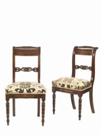 in mogano filettato in acero, sedie con seduta rivestita in tessuto operato a fiori, schienale sagomato a giorno con traversa intagliata e traforata a colli di cigno che inquadrano fiori e fascia intarsiata a girali fogliacei, gambe anteriori tornite e posteriori a sciabola; poltrone analogamente realizzate con braccioli a giorno su sostegni a delfini e schienale imbottito in tessuto operato, alt. cm 90