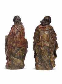 in legno scolpito, intagliato e dipinto in policromia a estofado, raffiguranti gli evangelisti Matteo e Giovanni, alt. cm 28
