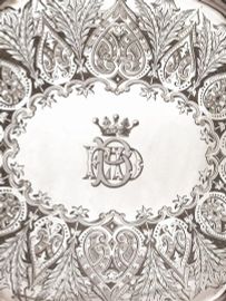 in metallo argentato, di forma ovale sagomata con piano elegantemente inciso a foglie ed elementi vegetali, quattro piedini a volute, al centro monogramma FBD coronato, cm 90x58