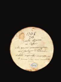 su tela applicata su vetro raffigurante la grotta azzurra di Capri, diam. cm 9,4, foderata sul retro in carta con iscrizione: