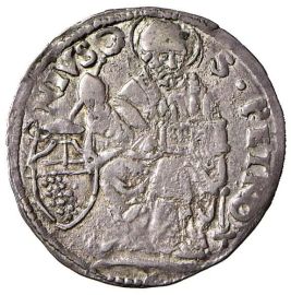 Ag gr. 2,04 D/ BONONIA DOCET Nel campo stemma semiovale di Bologna inquartato nel I e IV dall’arma crociata e nel II e III da quella con il motto LIBERTAS, cimasa fogliata e fiore R/ S PETRO NIVS Nel campo santo seduto con la città nella mano sinistra e pastorale nella destra Chim. 288 Raro q.SPL