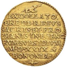 Au gr. 13,8 D/ COGENTE INOPIA REI FRVMENTARIE Busto di S. Petronio che regge la città con la d. e tiene il piviale nella s. sopra stemma inquartato della città R/ cane accucciato a d. // EXCOLLATO // AERE DE REBVS // SACRIS ET PRO // PHANIS IN EGENO // RVM SVBSIDIVM // M D XXIX foglia BONONIA // foglia Chim. 278 SPL Estremamente raro