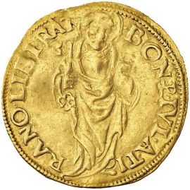Au gr. 3,42 D/ IVLIVS II PONT MAX Nel campo stemma decagono del pontefice sovrapposto alle chiavi decussate e sormontato da tiara in quadribolo R/ BON P IVL A TI RANO LIBERAT Nel campo San Pietro stante Chim. 235 Munt. 87 Molto raro BB