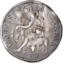 Ag gr. 4,45 D/ Busto a d. del Granduca R/ S. Giovanni seduto con un nastro con scritto “ecce agnus dei” e presso di lui un agnello. MIR 268/2.