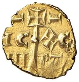 Au gr. 0,70 D/ Legenda pseudo-cufica; cerchietto con sei globetti a forma di fiore R/ Croce astile accantonata da IC XC NI KA. Spahr 85.
