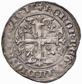Ag gr. 3,97 D/ Il Re coronato seduto di fronte tra due protomi di leoni R/ Croce gigliata cantonata da fiordalisi MIR 28 Pannuti Riccio 1/2