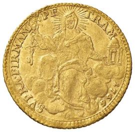 Au gr. 3,4 D/ CLEM XIII PONT M A VIII Stemma sormontato da triregno e chiavi decussate R/ SVPRA FIRMAM PE TRAM 1766 La Chiesa sulle nubi Munt. 7 BB