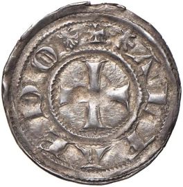 Ag gr. 0,87 D/ + SENA x VETVS S tra quattro globetti R/ + nicchio ALFA ED O nicchio Croce patente. CNI 74 MIR 494.
