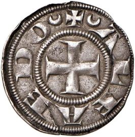Ag gr. 1,79 D/ + SENA VETVS S tra quattro crocette R/ + crescente lunare ALFA ED O crescente lunare Croce patente. CNI 51/2 MIR 489/8.