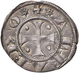 Ag gr. 1,34 D/ + SENA • VETVS S tra quattro globetti R/ + stella ALFA ED O stella Croce patente tra quattro globetti. CNI 38/40 MIR 492.