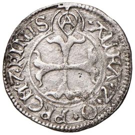 Questo grossetto differisce dal precedente in quanto presenta una doppia cornice di cerchi lineari nel campo in luogo delle centine. Differenze si riscontrano anche nella composizione delle legende (in questo esemplare le lettere sono abbreviate e lo stile epigrafico della “A” è di tipo gotico). La presenza del medesimo segno di zecca su entrambi i grossetti ci induce a ritenere i due nominali coevi. Trattasi di una moneta di particolare rarità i cui esemplari identificati dallo scrivente, incluso il presente, si contano in numero di tre.