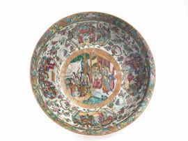 in porcellana Canton della famiglia rosa, decorata internamente ed esternamente con figure e fiori, diam. cm 46,5