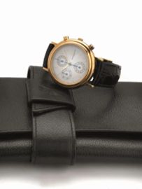 Cassa in oro lucido e satinato, lunetta chiusa da quattro viti, lunetta modanata, pulsanti cronografici tondi, vetro zaffiro. Quadrante argenté guilloché con indici applicati a bastone, tre quadranti ausiliari rispettivamente per le 12 ore, i 30 minuti e i secondi continui, secondi cronografici al centro, lancette a ago. Movimento a carica automatica calibro 1126, cassa, quadrante e movimento firmati.