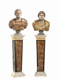 in marmi colorati raffiguranti Nerone e Giulio Cesare su basi modanate; alt. rispettivamente cm 71 e cm 72; poggianti su piedistalli lastronati in marmi colorati, fusto troncoconico rastremato, base modanata in marmo bianco, cm 132x41,5x27