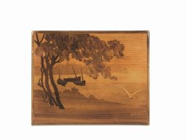 in legno intarsiato, piani di forma rettangolare, due dei quali intarsiati con motivi floreali, uno con gatti e uno con paesaggio marino con alberi e barche, gambe a giorno a lira riunite da traverse, tutti firmati Gallé, il più grande cm 70x57,5x40