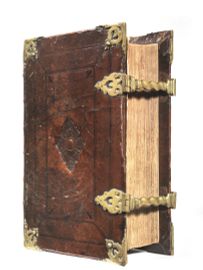 In folio (355 x 235 mm) in 4 parti. [xxiv] 332 [2] 144 [14] 169 [3] 58 carte. Frontespizio architettonico inciso, e 6 tavole calcografiche a doppia pagina (mappa del mondo; De Gelegentheyt van’t Paradys en’t Landt Canaan; Peregrinatie oste Veertich-Iarige Reyse der Kinderen Israels; mappa di Gerusalemme; Het beloofde Landt Canaan; De Beschryvingh van de Reysen Pauli, en van de Andere Apostelen). Testo in gotico, in olandese, su due colonne. Iniziali xilografiche. Legatura coeva in pieno marocchino scuro decorato a secco su assicelle di legno; piatti bisellati con mandorla centrale riquadrata da cornici concentriche di doppi filetti, gigli accantonati; dorso a 6 nervi; cantonali e fermagli decorativi in ottone. Strappi alla seconda mappa, qualche minimo restauro marginale, dorso rinnovato in stile.