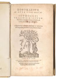 (Estienne) SOPHOCLES. Sophokleous hai Hepta tragōidiai. Sophoclis Tragoediae septem. Vna cum omnibus Graecis scholiis, & cum Latinis Ioach. Camerarij. Annotationes Henrici Stephani in Sophoclem & Euripidem, seorsum excusae, simul prodeunt. [Ginevra, Estienne, Henri], 1568.