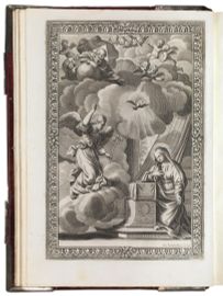 In folio (320 x 230 mm). 460 lxxx pp. Frontespizio e testo su due colonne stampati in rosso e nero, con iniziali e fregi xilografici. Vignetta al frontespizio e 3 tavole calcografiche, tutte incise da Suor Isabella Piccini. Legatura coeva in velluto cremisi riccamente decorata in argento, tagli dorati e goffrati, 6 segnacoli in seta verde tenuti assieme da fermaglio in argento. Strappo alla carta D4, qualche traccia del tempo, ma nel complesso copia bellissima su carta forte.