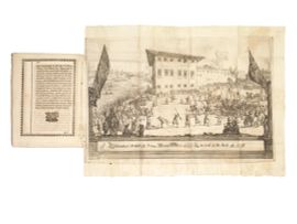 In 4to (223 x 166 mm). [ii] 21 [1] pp. ed una tavola calcografica più volte ripiegata, sottoscritta “ercole Bazzacaluuve D.D.” Testo in cornice, iniziali e fregi xilografici. Antica carta d’attesa, minime tracce del tempo, esemplare in perfette condizioni.