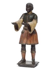 in legno dipinto in policromia, raffigurato stante nell’atto di sorreggere un vassoio di forma sagomata, decorato con composizione di fiori e volatili entro cornice sagomata, cm 110x62x68