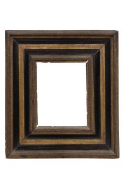 in legno ebanizzato con profili e cornici in legno intagliato e dorato, battuta scolpita a più ordini, gola liscia intervallata da fasce a motivo guilloché che orna anche il bordo esterno; ingombro cm 83x76; luce cm 41x33