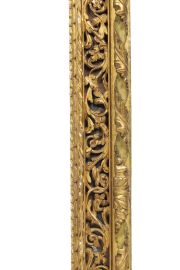in legno intagliato laccato e dorato, battuta liscia con controbattuta rilevata scolpita a motivo di nastro ritorto fogliaceo che si apre in foglie aperte ai centri e agli angoli, gola diritta scende su fascia a giorno a ramages fiorite ricorrenti su fondo a specchio alternate a cartelle sagomate agli angoli, bordo rilevato a nastro ritorto scende a muro con motivo a mezzefoglie; doratura a guazzo in oro zecchino con preparazione a bolo; ingombro cm 123x156, luce cm 90x123,5