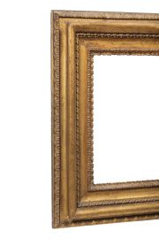 in legno intagliato e dorato, battuta lievemente aggettante intagliata a motivo di foglie e sottofoglie rivolte verso l'interno, gola liscia risale su bordo rilevato a nastro ritorto cui segue un'ampia fascia aggettante che con una gola rovescia si porta su bordo a foglie e sottofoglie rivolte verso l'esterno digradante a muro; doratura a guazzo in oro zecchino con preparazione a bolo; ingombro cm 120x102,5, luce cm 71x54,5