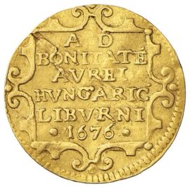 Au gr. 3,48 D/ COSMVS III D G MAG DVX ETRV VI Il Granduca, radiato e in armatura, stante a d., stringe nella mano d. lo scettro e poggia la s. sull’elsa della spada R/ AD / BONITATE / AVREI / HVNGARIC / LIBVRNI / 1676 entro cartella ornata MIR 72/3