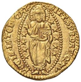 D/ ANTO VENERIO S. Marco porge il vessillo al Doge genuflesso R/ SIT T XPE DAT Q TV REGIS ISTE DVCAT Il Redentore, circondato da stelle, entro aureola ellittica Au gr. 3,51 Mont. 135