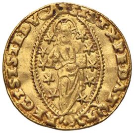 D/ FRAN DON S. Marco porge il vessillo al Doge genuflesso R/ SIT T XPE DAT Q TV REGIS ISTE DVCAT Il Redentore, circondato da stelle, entro aureola ellittica Au gr. 3,45 Mont. 445