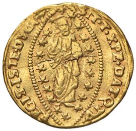 D/ FRANC ERIZZO S. Marco porge il vessillo al Doge genuflesso R/ SIT T XPE DAT Q TV REGIS ISTE DVCAT Il Redentore, circondato da stelle, entro aureola ellittica Au gr. 3,47 Mont. 1500