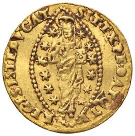 D/ PETR LAVR S. Marco porge il vessillo al Doge genuflesso R/ SIT T XPE DAT Q TV REGIS ISTE DVCAT Il Redentore, circondato da stelle, entro aureola ellittica Au gr. 3,46 Mont. 611