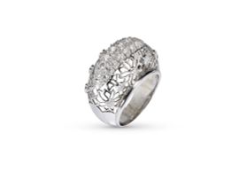 di forma bombata, lavorato a traforo con al centro e sui lati diamanti taglio brillante ct. 1.20 circa, mis. 15, g 10