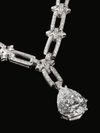 realizzata a maglie rettangolari impreziosite da pavè di diamanti, al centro un diamante taglio goccia di ct 5.75, colore F, purezza VVS1, punzone 750, lungh. cm 40,5, g 45