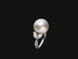 di colore leggermente grigio con sfumature rosate, diam. da mm. 13,65 a mm 14,05, montata al centro di un anello tra due coppie di diamanti per ct 1.20 circa, mis. 11, g 9