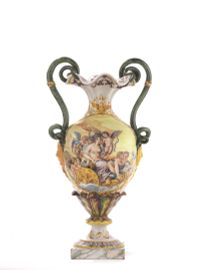 in maiolica dipinta in policromia; corpo piriforme con larga bocca svasata, impreziosita da due anse serpentiforme sorrette da mascheroni, poggiante su base quadrata, decorato sulle due facce con grandi scene mitologiche entro riserva ovale, una a fondo giallo, l’altra a fondo azzurro. Marcato Nove con asterisco sul fondo; alt. cm 60