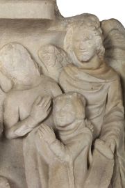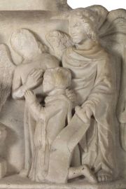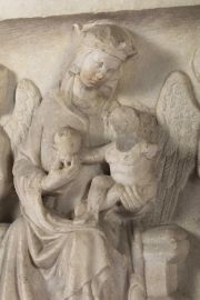 Nonostante l’appannarsi dei volti nella consunzione della pietra, anche il bassorilievo qui presentato mostra una scena più sciolta e una certa attenzione nella descrizione delle vesti. Lo sguardo della Vergine è poi convincentemente indagato nella dolcezza materna con cui si rivolge al figlio e l’accennata torsione impressa alla sua figura rimanda ai modelli pisani della grande scultura gotica, quali Giovanni di Balduccio che esercitò una forte suggestione sugli artisti attivi nei contesti dove furono collocate le sue opere, come Sant’Eustorgio a Milano.