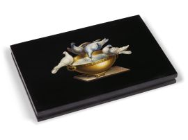 in marmo nero del Belgio e micromosaico raffigurante Le colombe di Plinio, cm 11x17,4. Entro cornice in legno dorato. Sul retro etichetta delle Rev. Fabbrica di S. Pietro in Vaticano con titolo La tazza delle Colombe del Campidoglio e prezzo Lire 100
