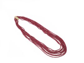 realizzata a multifili di rubini, chiusura in oro giallo con piccoli brillanti, punzone 750, lungh. minima cm 56, g 48