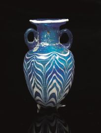Amphoriskos, contenitore per unguenti profumati, in pasta vitrea lavorata con la tecnica del nucleo friabile. Il vaso che riprende, miniaturizzandola, la forma di un’anfora da trasporto, con orlo svasato, collo cilindrico, corpo ovoidale e puntale conico, è in pasta vitrea di colore blu-azzurro, decorata da filamenti di colore bianco. In questo caso l’amphoriskos conserva il suo sostegno cilindrico in oro. H. 7,8 cm